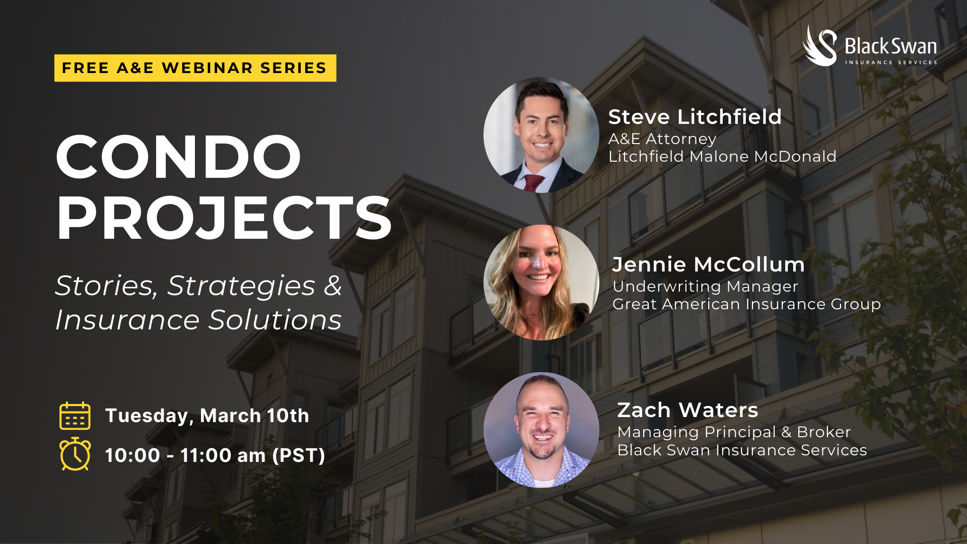 Join us for a free webinar for Architects & Engineers on Condo Projects: Stories, Strategies & Insurance Solutions. Hear real-world lessons and practical strategies for navigating condo insurance challenges, underwriting considerations, and legal risk, followed by a live Q&A. Featuring Jennie McCollum (Great American Insurance Group), Stephen Litchfield (Litchfield Malone McDonald), and Zach Waters (Black Swan Insurance Services).